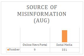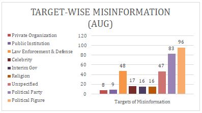 The evaluation of misinformation trends for August 2025 presents a comprehensive picture of a highly politicized and digitally mediated information environment. With a total of 340 documented cases, this period underscores the extent to which misinformation has infiltrated public discourse, particularly in the political realm, with 268 cases (78.8%). In contrast, political figures were targetedin 96 (28.24%) cases. This overwhelming dominance highlights a sustained and strategic use of misinformation as a tool for political manipulation. Social media emerged as the predominant channel of dissemination, being the source in 331 out of 340 cases (97.35%). The findings emphasize not just the scale of the misinformation problem but also its systemic and intentional nature, particularly within politically sensitive contexts. The convergence of misinformation production, algorithmic distribution, and emotionally charged narratives necessitates urgent multi-stakeholder intervention, including regulatory oversight, digital literacy programs, and platform accountability measures.
